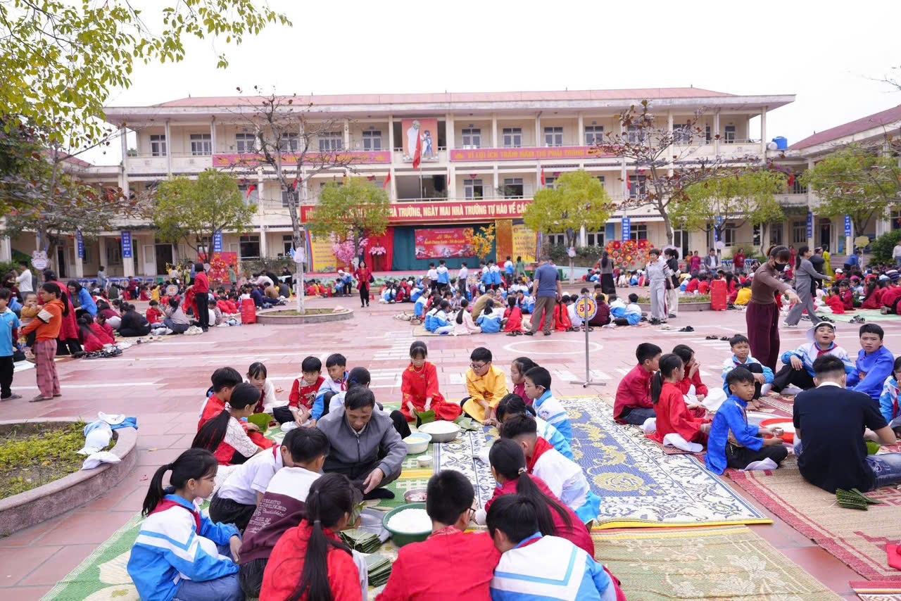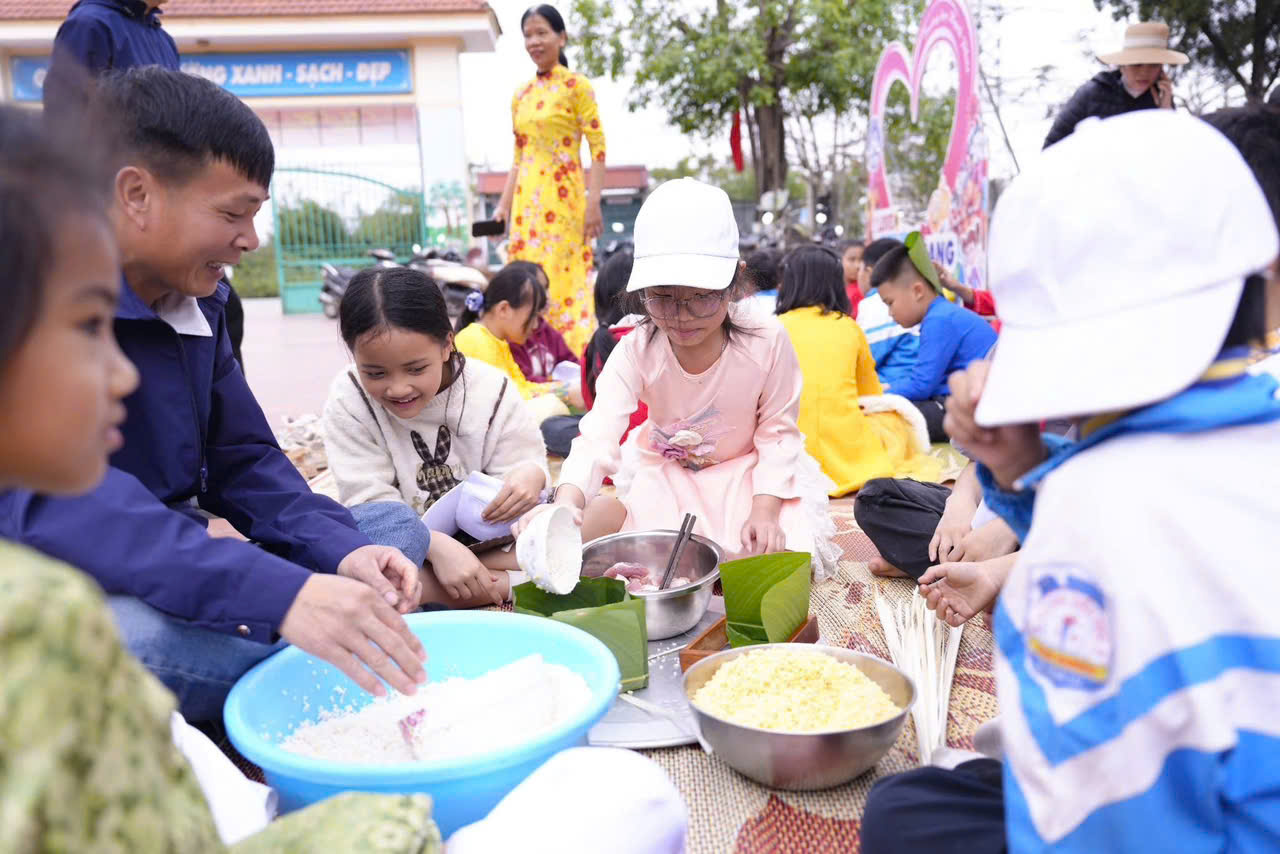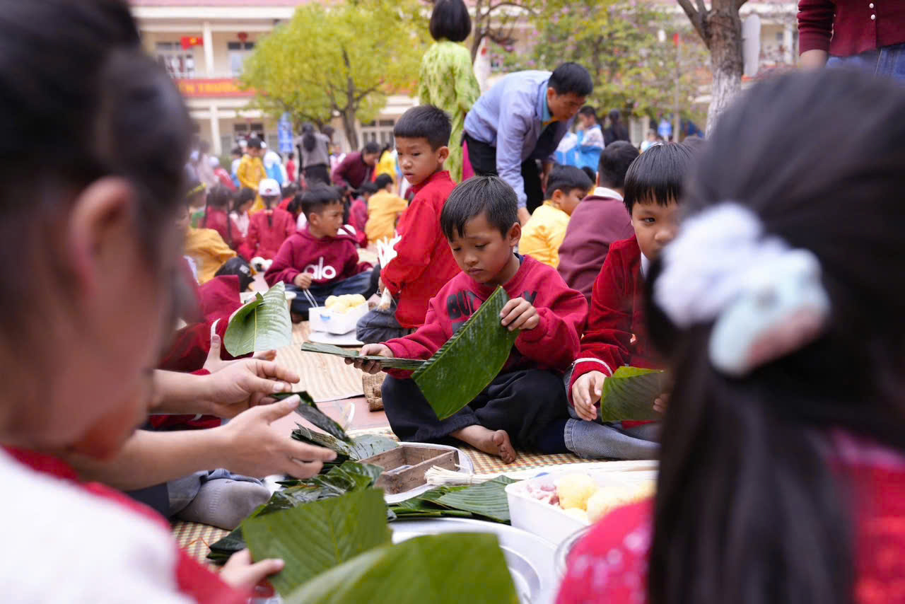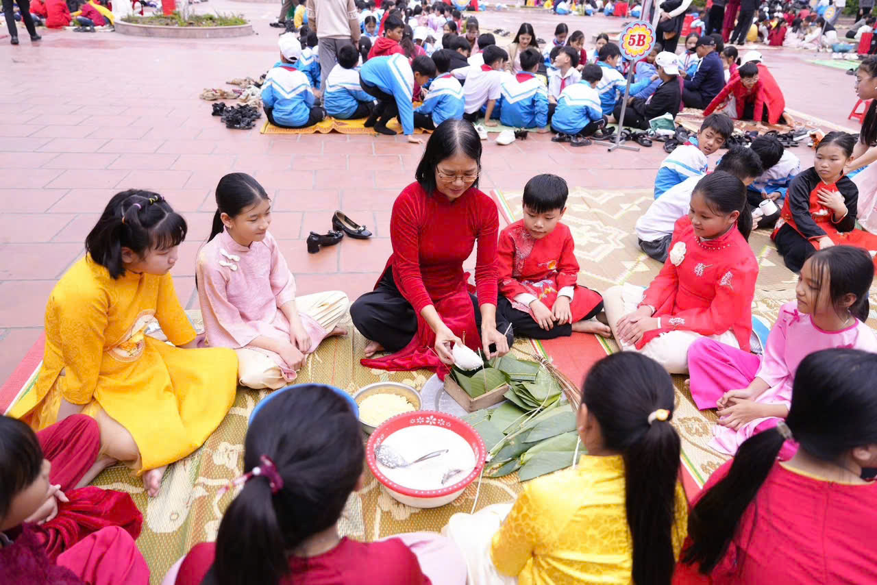 Những ngày cuối năm, khi cơn gió lạnh của mùa đông dần nhường chỗ cho cái nắng ấm áp của nàng xuân, sân trường Tiểu học Ninh Giang lại rộn ràng hơn bao giờ hết với tiếng cười vang và mùi thơm nồng nàn của lá dong, gạo nếp, đỗ xanh và thịt lợn.